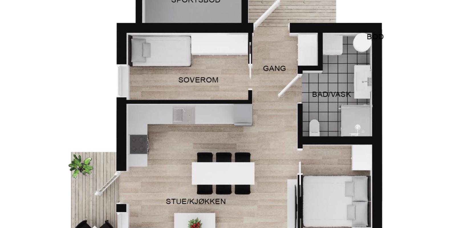 Planløsningen er åpen og praktisk, med naturlige soner for både samvær og hvile. Kjøkken og stue er samlet i ett sosialt hjerterom med godt lysinnslipp og enkel tilgang til uteplass. Her er det rom for å samle hele familien – eller bare nyte en stille morgen med kaffekoppen.