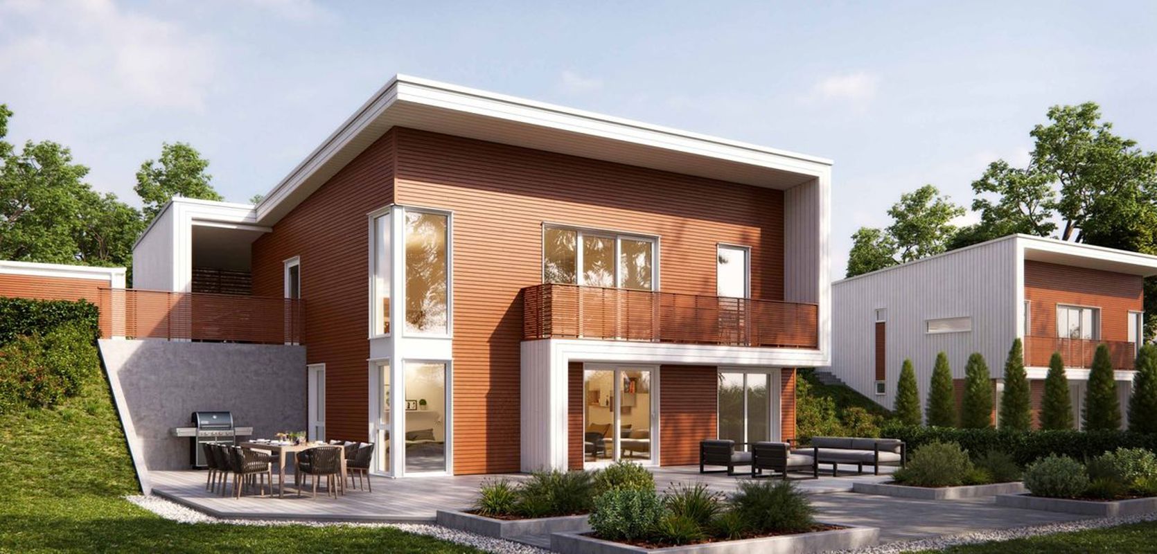 Signatur 301 er tilpasset for skrå tomter, og med sitt moderne uttrykk, store vindusflater og praktiske romløsninger vil det være et drømmehus for mange.