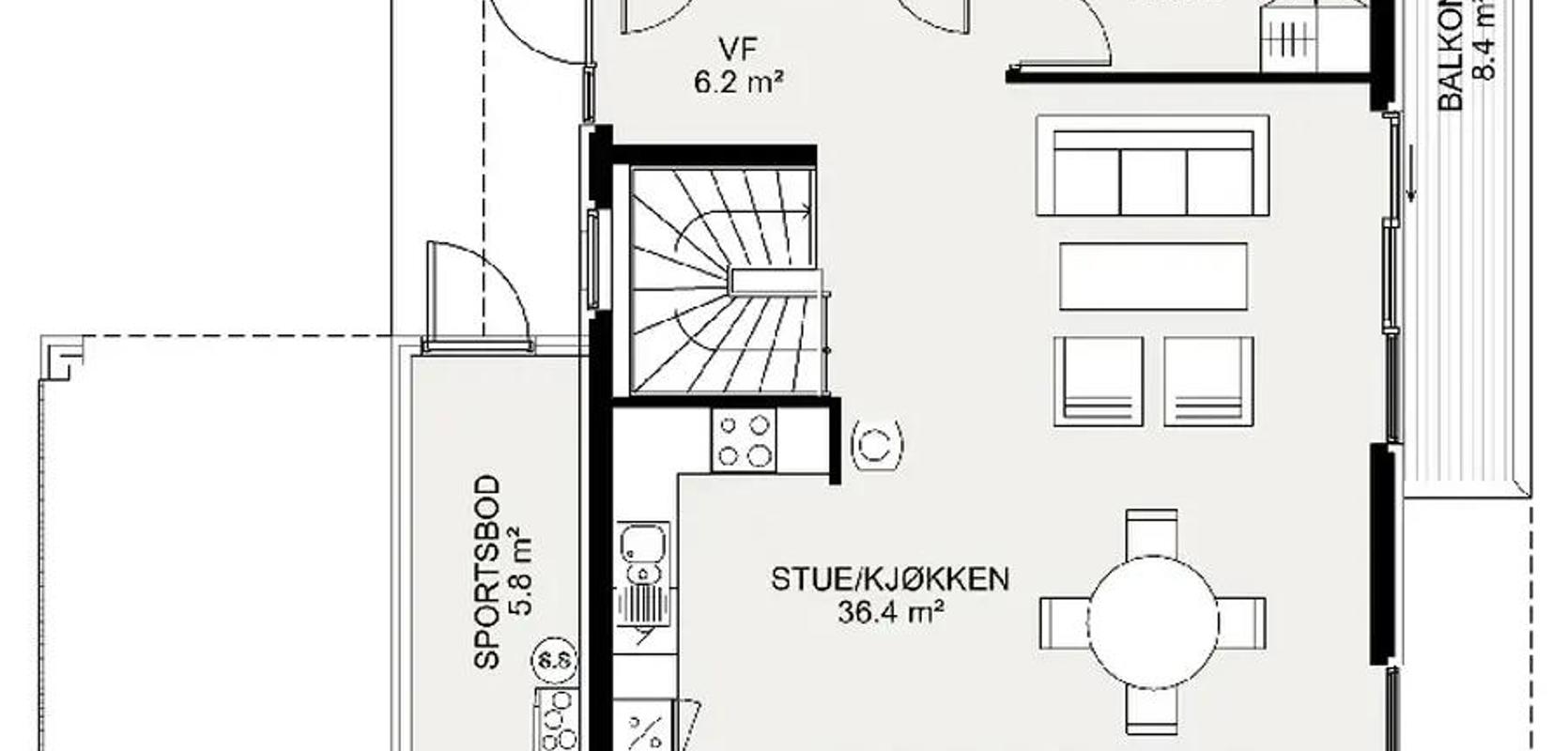 På grunn av den skrå tomten ligger adkomsten til huset på øvre plan, med en stor overbygget carport og sportsbod som skaper et flott inngangsparti og tilknytning til huset. Inne i huset finner du alle nødvendige hovedfunksjoner på ett plan, inkludert stue, kjøkken, bad og soverom. Det store fellesrommet, som kombinerer både kjøkken og stue, har et flott hjørnevindu og store vindusflater som gir mye lys og karakter. Du har også tilgang til en lang balkong fra stuen gjennom en skyvedør i glass som skaper en fin åpenhet på varme dager.