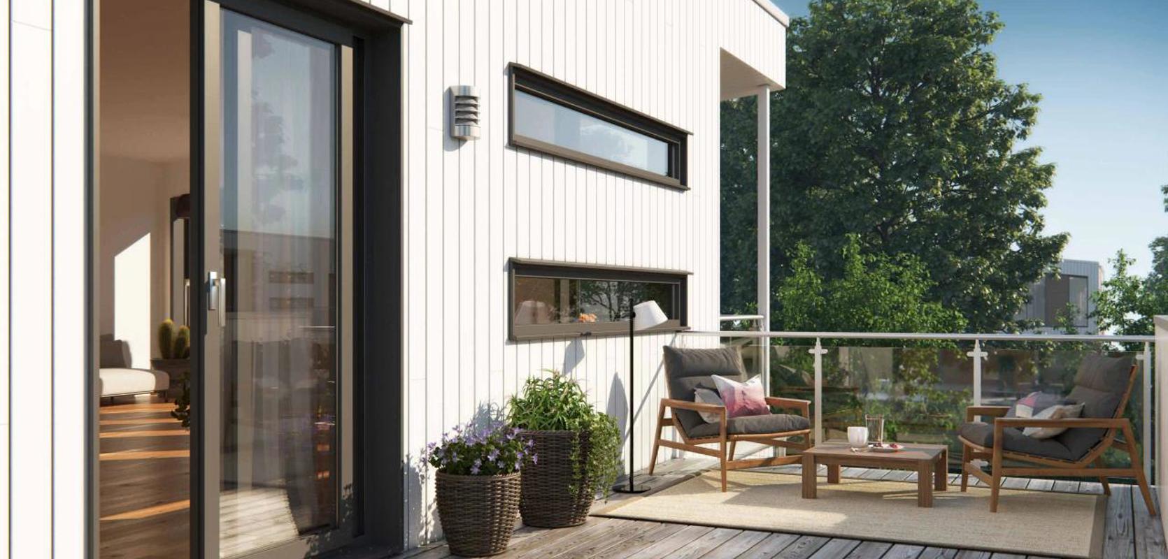 Inkludert er egen carport, tre komfortable soverom, to balkonger, en innbydende åpen stue- og kjøkkenløsning, to bad og separat vaskerom. Boligen er tilpasset flat tomt, og kan også kjedes for større feltutbygginger.