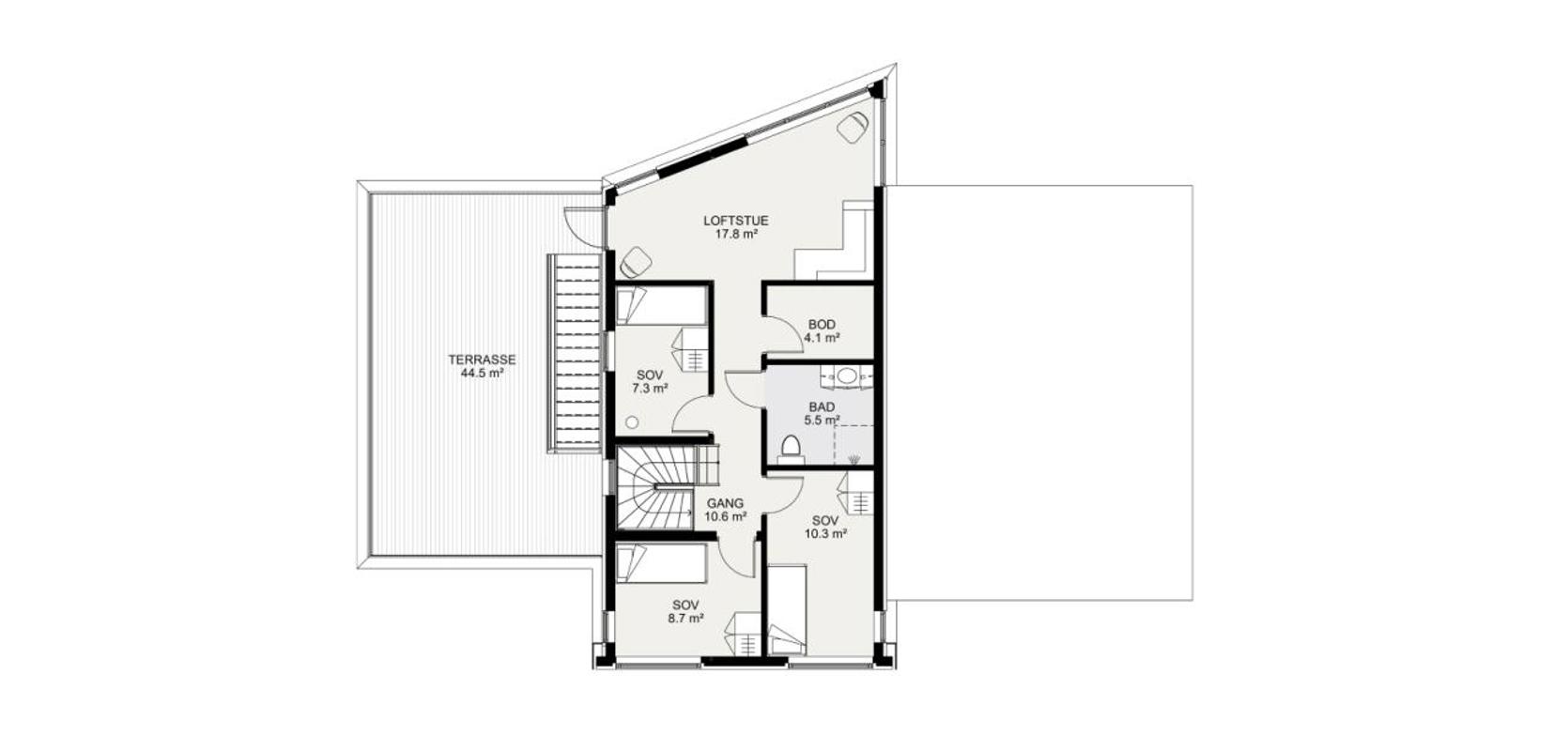 En trapp fra hallen fører deg til husets loftsetasje, hvor du finner tre ekstra soverom, et bad, en praktisk bod og en spennende loftstue. Denne har en unik skråvegg som skaper et karakteristisk overheng over uteplassen på grunnplanet. Store panoramavinduer, som går fra gulv til tak, gir deg en imponerende utsikt og gjør loftstuen til et unikt samlingssted. Signatur 307 er det ideelle huset for deg som ønsker noe litt annerledes og moderne.